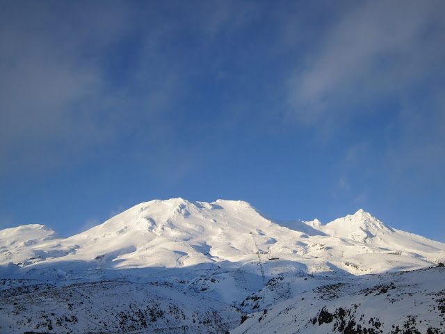 Nous sommes allés skier à Turoa, sur les flancs du Mont Ruapehu, qui n'est autre qu'un volcan! Outre l'odeur de souffre présente sur les pistes, la vue est complètement dégagée puisque aucun arbre ou végétation ne pousse à côté du volcan.